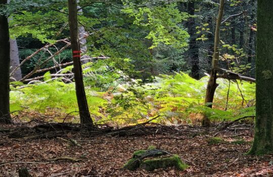 Der Herbst hat eine ganz besondere Stimmung und bündelt noch einmal in aller Stille Energie und Kraft, um sich auf den Winter vorzubereiten. Wir wollen raus ins Grün und je nach Verfärbung den bunten Wald erleben. Vom Anfang November schon etwas ruhiger gewordenen Eifeldörfchen Einruhr besteigen wir zunächst den kleinen Aussichtsgipfel „Schöne Aussicht“. Über Wiesen vorbei am einzigen Weinberg im Rurtal geht´s Richtung Hammer und von dort in das einsame Riffelsbachtal. Über einige Kilometer sanft ansteigend erreichen wir das Forsthaus „Rote Kreuz“auf fast 600 m Höhe. Richtung Erkensruhr folgen wir nun dem leise gurgelnden Püngelsbach bis Hirschrott. Der nächste Abschnitt auf gleichbleibender Hanghöhe durch den geschlossenen Buchenwald Dedenborn bietet bei Herbstfärbung sicher ein stimmungsvolles Farb- und Lichtfeuerwerk. Erst kurz vor Einruhr fällt der Weg ab und bringt uns nach rund 21 km wieder zurück in den Ort.