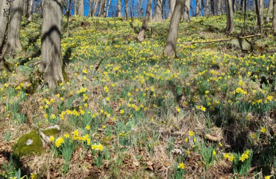 Wir wandern durch das Dörfchen Lonzen zum Hohnbachtal, entlang der Geul Richtung Emmaburg und wieder zurück. Unterwegs beglücken uns abertausende wilde Narzissen, ein echtes Naturspektakel. Ebenso wie ein Bärlauchfeld, das wir durchqueren werden.